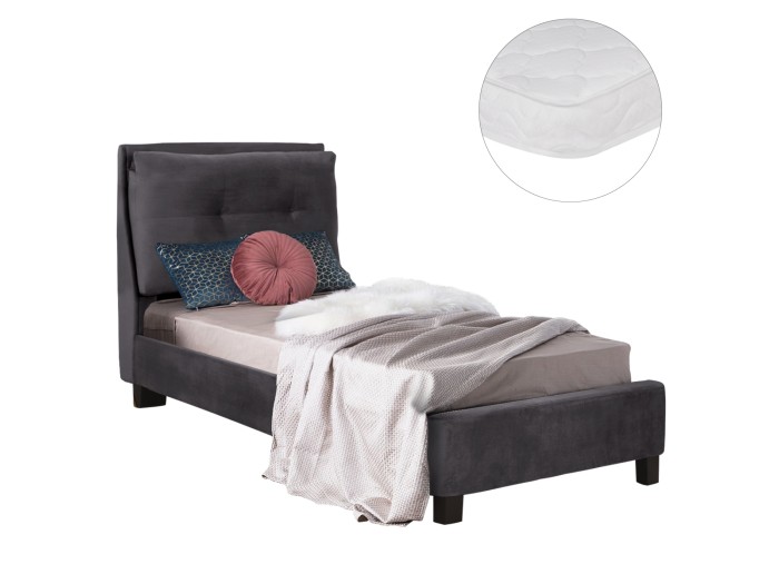 Το μονό κρεβάτι RILEY είναι επενδυμένο με βελούδο σε ΓΚΡΙ χρώμα. Το στρώμα (διατίθεται σε ROLL-PACKING*) που συνοδεύει το κρεβάτι τοποθετείται σε δύο σειρές ανατομικές τάβλες, είναι διπλής όψης και είναι ΑΦΡΟΥ χωρίς ελατήρια. Τα πόδια είναι σχετικά ψηλά από πολυπροπυλένιο σε μαύρο χρώμα.