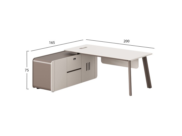 Διαθέτει οβάλ άνοιγμα στην επιφάνεια για σωστή τακτοποίηση καλωδίων και καθαρό workspace. Η γωνιακή μονάδα είναι πλήρως εξοπλισμένη με ντουλάπι χωρίς ράφια, συρτάρι με κλειδαριά συνδυασμού 3 αριθμών, βαθύ συρτάρι με κρυφό χερούλι και ντουλάπι κάτω από την επιφάνεια με έτοιμη εγκατάσταση για πρίζες, αφήνοντας τον απαραίτητο ελεύθερο χώρο για καλώδια και εξοπλισμό. Τα 2 πόδια αλουμινίου σε ανοιχτό καφέ προσθέτουν σταθερότητα και μοντέρνο χαρακτήρα.