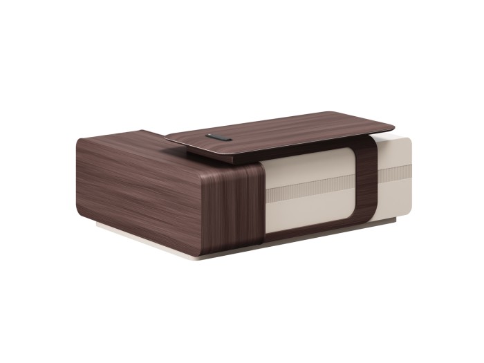 Το γωνιακό γραφείο PRESIDENT σε δεξιά γωνία όπως κάθεστε αποτελεί ακόμα μια σύγχρονη και λειτουργική λύση για επαγγελματικούς, κυρίως, χώρους γραφείου. Ο σχεδιασμός του συνδυάζει μελαμίνη σε καρυδί απόχρωση με κομψές λεπτομέρειες σε μπεζ, δημιουργώντας ένα εκλεπτυσμένο και επαγγελματικό αποτέλεσμα.