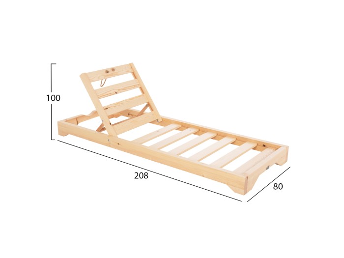 --Ολόκληρη η ξαπλώστρα έχει κατασκευαστεί από ξύλο πεύκου με εμποτισμό και επιπλέον στρώση με βερνίκι νερού. Το πεύκο είναι ένα μαλακό, λευκό ή ανοιχτό κίτρινο ξύλο το οποίο είναι ελαφρύ σε βάρος με ευθύγραμμα νερά ξύλου. Αντέχει στη συρρίκνωση, διόγκωση και κάμψη. Ο εμποτισμός υπό την ευρεία έννοια είναι ο χρωματισμός του ξύλου (συνήθως βερνίκια) με την μέθοδο της εμβάπτισης.