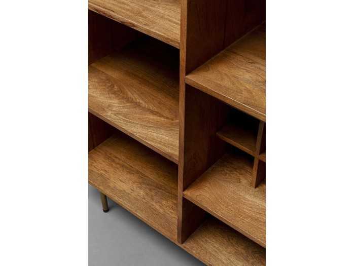 Τα μοντέλα της συλλογής Grace φέρνουν αρμονία στο σαλόνι με τις απαλές καμπύλες τους. Αφενός, αυτό οφείλεται στην κομψή σύνθεση υλικών από μασίφ ξύλο και μάρμαρο. Από την άλλη, η συλλογή παίζει με τις επιφάνειες, όπως τα μοτίβα και τα λεία τμήματα των ξύλινων μετώπων. Μια διακριτική, ορειχάλκινη διακοσμητική λωρίδα ολοκληρώνει το σχεδιασμό του οικιακού μπαρ. Το μπαρ δεν είναι απλώς ένα επιδεικτικό έπιπλο. Μπορείτε επίσης να χρησιμοποιήσετε ένα μπαρ για να διαχωρίσετε οπτικά την τραπεζαρία από το καθιστικό, για παράδειγμα.Καφέ μπαρ για το σπίτι από μασίφ ξύλο, 110 x 120 x 48 cm (Υ/Β/Δ)