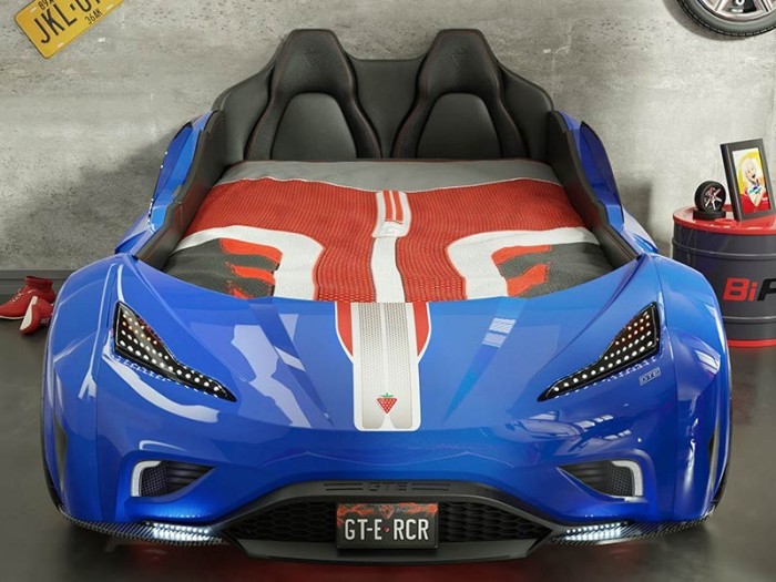Ένα εντυπωσιακό μπλε παιδικό κρεβάτι αυτοκίνητο GTE-1373 που τραβάει πάνω του όλα τα βλέμματα