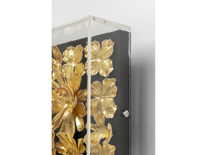 Αυτό το διακοσμητικό τοίχου με την εκλεκτή διακόσμηση λουλουδιών και το λαμπερό χρυσό χρώμα δημιουργεί μια κομψή και ατμοσφαιρική εμφάνιση, πάνω σε μαύρο πάνελ από mdf.