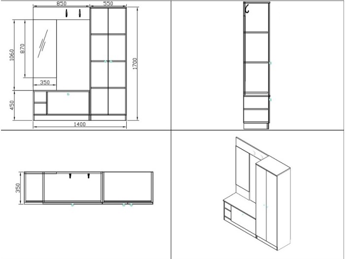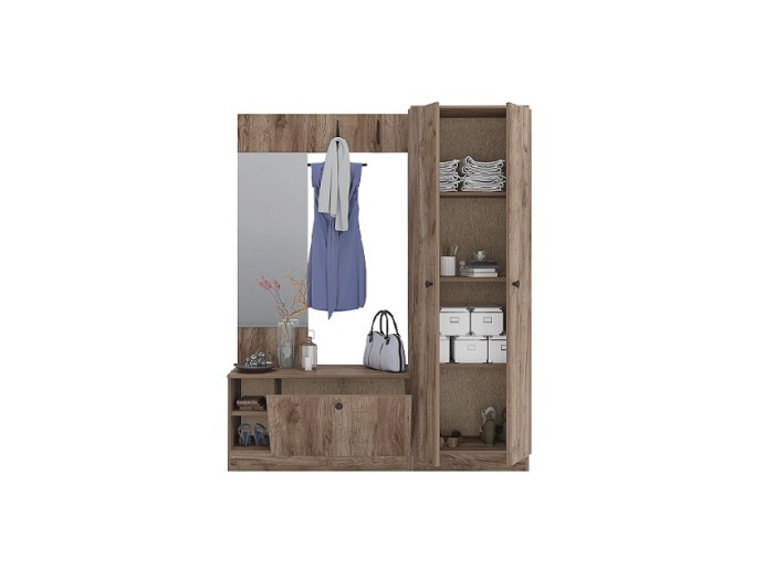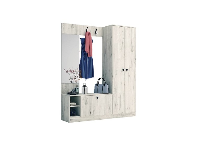 Σύνθεση εισόδου Marea2 είναι ένα πάνελ με καθρέφτη, κρεμάστρες, κλειστό ντουλάπι με αρθρωτή πόρτα, δύο κόγχες και ντουλάπα με τρία ράφια.