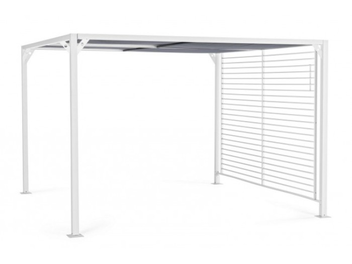 Μεταλλικό κιόσκι αλουμινίου με επίστρωση πολυεστερικής, ηλεκτροστατικής βαφής, και συρτή υφασμάτινη αντηλιακή προστασία.