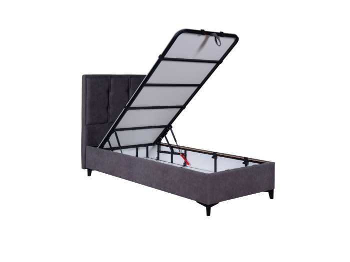Κρεβάτι με αποθηκευτικό χώρο! Διαθέτει αεριζόμενο, αντιμικροβιακό, ευρύχωρο αποθηκευτικό χώρο και 4 αμορτισέρ ασφαλείας διπλής ενέργειας, που ανασηκώνουν εύκολα το στρώμα. Ειδική σχεδίαση και κατασκευή του κρεβατιού για απόλυτη απουσία τριγμών. Μεταλλικός σκελετός ηλεκτροστατικής βαφής, εξαιρετικής αντοχής, αντικραδασμικός. Πλαϊνά από οικολογική μελαμίνη, επενδυμένα με αφρώδες υλικό & ύφασμα . Απόλυτα επίπεδη και ενιαία επιφάνεια, ιδανική για κάθε τύπο στρώματος .Η επιφάνεια του υποστρώματος είναι καλυμμένη με αντιολισθητικό ύφασμα για την καλύτερη συγκράτηση του στρώματος. Ο πάτος είναι από μελαμίνη πάχους 8mm και φέρει αεραγωγούς. Ψηλά ποδαράκια για εύκολο καθάρισμα.