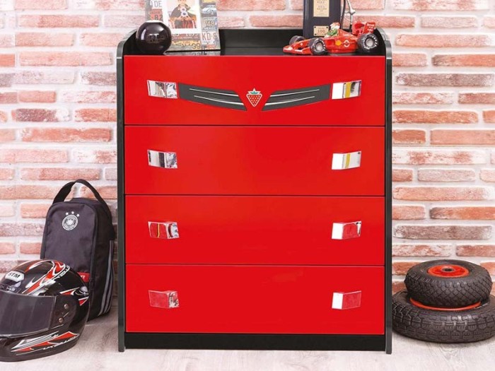 Παιδική συρταριέρα από την σειρά Young Racer. Εξαιρετική συρταριέρα με 4 βαθιά και πολύ ευρύχωρα συρτάρια. Την προσοχή τραβάνε αμέσως τα πολύ ιδιαίτερα χερούλια. Ο καλύτερος τρόπος να ταξινομήσετε με ευκολία τα παιδικά ρούχα. Μοντέρνος σχεδιασμός σε φωτεινά χρώματα.