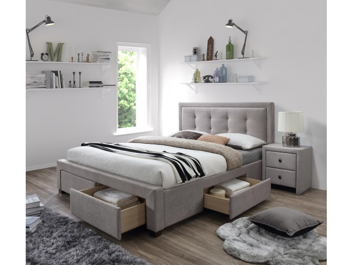 EVORA κρεβάτι με συρτάρια, υλικό: πανί / μασίφ ξύλο, χρώμα: πανί - μπεζ, ξύλο - καρυδιά