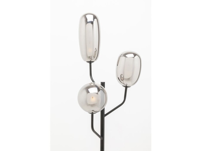 Ένα κομψό φωτιστικό δαπέδου που συνδυάζει minimal αισθητική με σύγχρονο design. Ο λεπτός μεταλλικός σκελετός σε μαύρο φινίρισμα υποστηρίζει τρεις γυάλινες αποχρώσεις σε διαφορετικά σχήματα και ύψη, δημιουργώντας ένα ενδιαφέρον και ισορροπημένο φωτιστικό αποτέλεσμα.