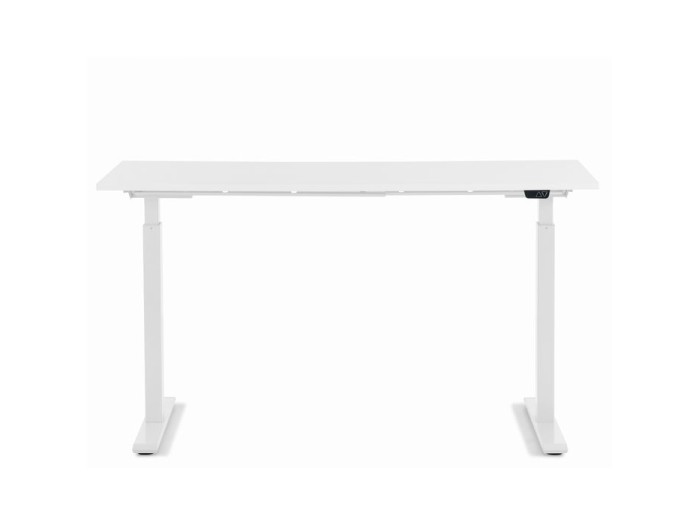 Ένα ορθογώνιο, ηλεκτρικά ρυθμιζόμενο γραφείο με στιβαρή, λευκή μαύρη επιφάνεια MFC και λακαρισμένο πλαίσιο από χάλυβα σε λευκό χρώμα.