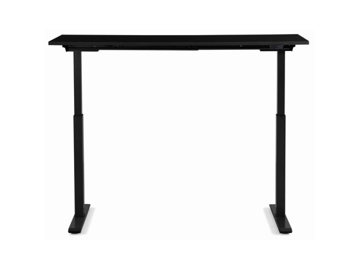 Ένα ορθογώνιο, ηλεκτρικά ρυθμιζόμενο γραφείο με στιβαρή, μαύρη επιφάνεια MFC και λακαρισμένο πλαίσιο από χάλυβα σε μαύρο χρώμα.