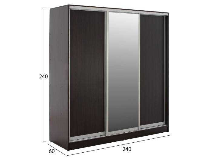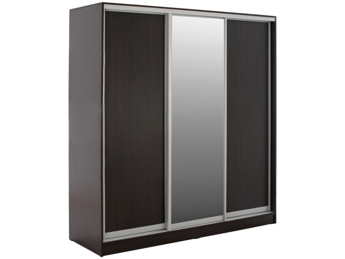 ΗΜ2462.02-Ντουλάπα---Γνωρίστε την 3-φυλλη ντουλάπα ADLER. Πρόκειται για μια πρακτικότατη ντουλάπα που έχει φτιαχτεί με γνώμονα την όσο το δυνατόν καλύτερη εκμετάλλευση του χώρου. Οι πόρτες είναι συρόμενες, ενώ η μία από αυτές είναι ολόκληρη εξοπλισμένη με καθρέπτη, για να μην χρειαστείτε ξεχωριστό έπιπλο που θα καταλάμβανε επιπλέον χώρο. Το εσωτερικό της ντουλάπας χωρίζεται σε 3 μέρη. Η δεξιά και η αριστερή πλευρά είναι πανομοιότυπες και αποτελούνται από ράφια με μεγάλο βάθος 60 εκ. Το μεσαίο τμήμα της ντουλάπας αποτελείται από 2 ράφια μεγάλα στο επάνω μέρος σαν παταράκια και ακριβώς από κάτω τους υπάρχει μια μεταλλική δοκός για κρεμάστρες. Η ντουλάπα αυτή έχει χρώμα WENGE και θα ταιριάξει σε κάθε σπίτι.