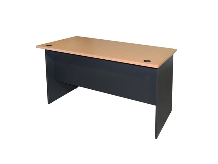 Επιφάνεια εργασίας απο μελαμίνη πάχους 25mm στο χρώμα οξιάς, με δύο εισόδους καλωδίων πάνω απο τα πόδια. Πόδια μελαμίνης πάχους 18mm σε χρώμα γκρί.