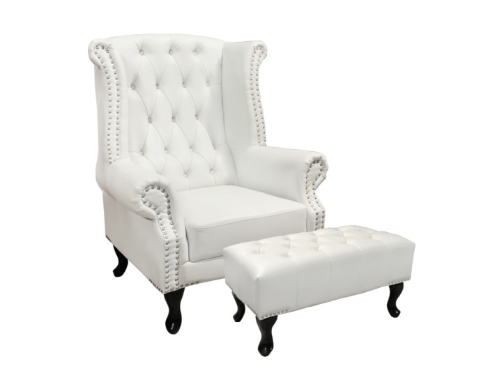 Σετ πολυθρόνα μπερζέρα και υποπόδιο, τύπου chesterfield καπιτονέ απο λευκό ματ τεχνόδερμα υψηλής ποιότητας και ενισχυμένο ξύλινο σκελετό στο εσωτερικό του και στα πόδια .