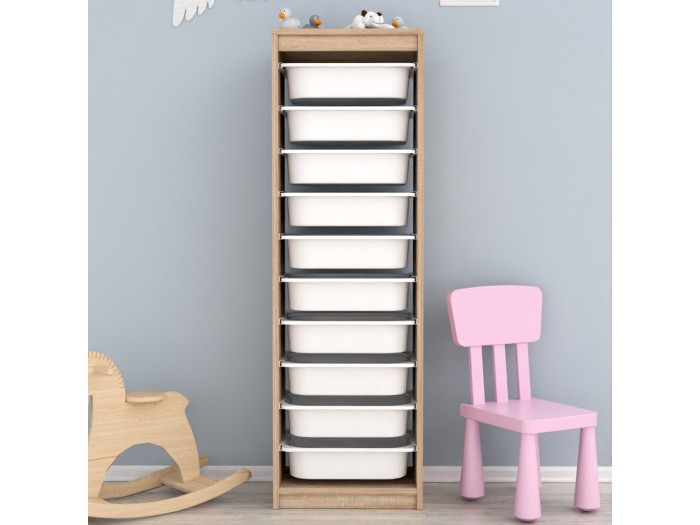 Η SANI είναι μια στενή και ψηλή συρταριέρα με πλαίσιο από μελαμίνη σε χρώμα SONAMA, και 10 ΛΕΥΚΑ συρτάρια από πολυαιθυλένιο (πλαστικό). Ιδανική συρταριέρα για την καλύτερη οργάνωση του παιδικού δωματίου.