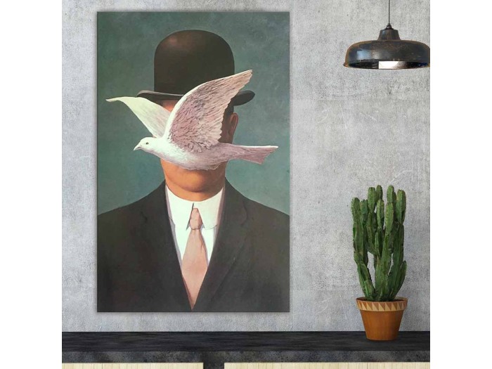 Ένας πίνακας τοίχου μεταμορφώνει τον τρόπο που αντιλαμβανόμαστε έναν χώρο. Διακοσμήστε, λοιπόν, τον χώρο σας με την καινούργια μας σειρά πινάκων τοίχου GOBI! Αυτός ο πίνακας που απεικονίζει ένα άνδρα με ψηλό καπέλο κι ένα περιστέρι, έχει υλοποιηθεί σε εκτυπωμένο SUEDE καμβά με πλαίσιο από ξύλο.