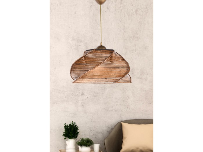 Μοντέρνο κρεμαστό φωτιστικό οροφής, κατασκευασμένο από ξύλινο σκελετό και επενδυμένο από bamboo υλικό σε καρυδί απόχρωση με μαύρες λεπτομέρειες.