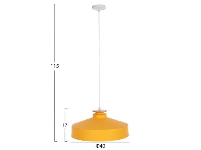 Ανακαλύψτε αυτό το νέο μας κρεμαστό φωτιστικό οροφής και ολοκληρώστε την διακόσμησή σας. Πρόκειται για ένα φωτιστικό με ΚΙΤΡΙΝΟ ρηχό μεταλλικό καπέλο σε σχήμα καμπάνας με λεπτομέρεια ξύλου στην κορυφή του φωτιστικού. Αισθητικά, ολοκληρώνεται με το λευκό καλώδιο κρέμασης και την λευκή βάση οροφής, και αποτελεί την τελευταία τάση στα φωτιστικά οροφής.