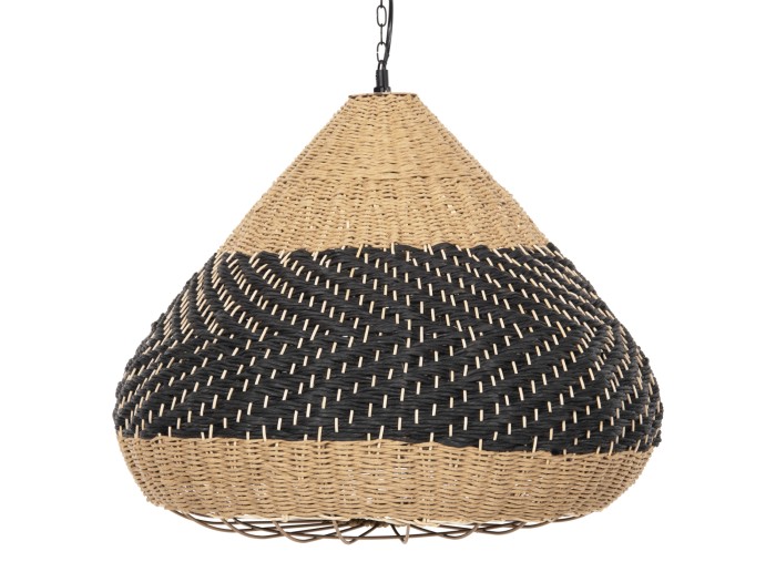 Αυτό το μεγάλο κρεμαστό φωτιστικό οροφής σε σχήμα καμπάνας διαθέτει μεταλλικό σκελετό και κρέμαση με αλυσίδα, ο οποίος είναι εξολοκλήρου επενδυμένος με φυσικό Rattan και paper rope σε ΦΥΣΙΚΟ και ΜΑΥΡΟ χρώμα. Ένα πολύ ιδιαίτερο φωτιστικό που διαχέει το φως προς τα κάτω και θα κλέψει τις εντυπώσεις όπου κι αν τοποθετηθεί.