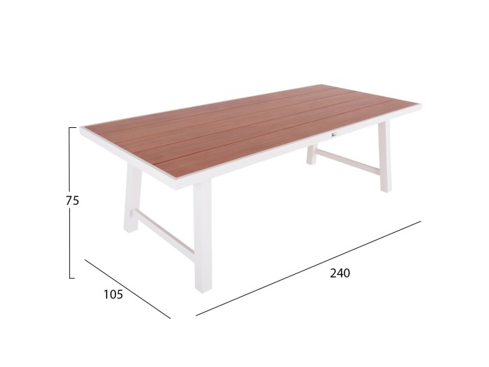 Το GOBAR είναι ένα μεγάλο ορθογώνιο τραπέζι για εξωτερικούς χώρους με σκελετό αλουμινίου σε ΛΕΥΚΟ χρώμα. Η επιφάνεια είναι επίσης από slats (φέτες) αλουμινίου σε χρώμα απομίμησης ξύλου. Πρόκειται για ένα τραπέζι που μπορεί να εξυπηρετήσει 8 τουλάχιστον άτομα, φιλοξενώντας τις πιο όμορφες στιγμές της ζωής σας.