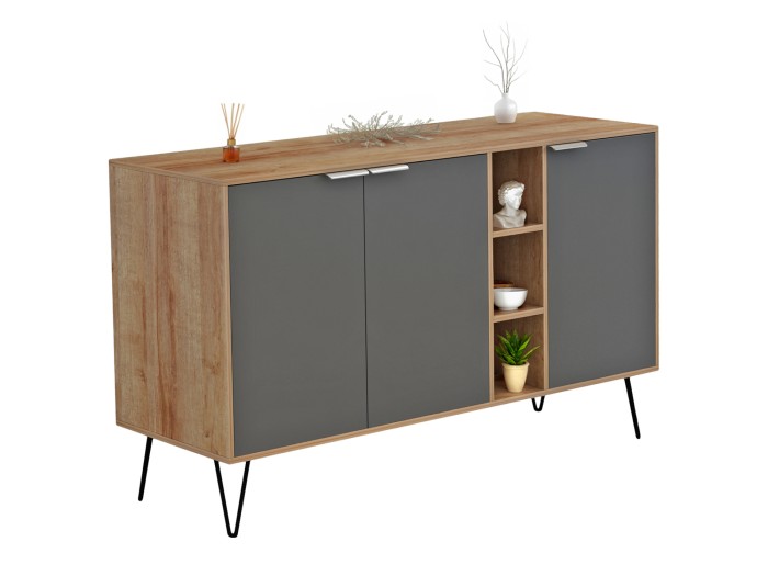 Ο μπουφές CABRON είναι ένα όμορφο έπιπλο όπου κι αν τον τοποθετήσετε. Έχει ψηλά ΜΑΥΡΑ μεταλλικά πόδια ενώ το μήκος του εξασφαλίζει ότι η επιφάνεια του είναι αρκετή για τοποθέτηση πολλών αντικειμένων. Στην αριστερή πλευρά όπως το βλέπει κάποιος, έχει ένα ντουλάπι με δύο πόρτες κι ένα ράφι στο εσωτερικό. Στην μέση σχεδόν του επίπλου και προς τα δεξιά, υπάρχει ελεύθερος χώρος με ραφάκια. Στην δεξιά πλευρά υπάρχει ένα μονό κλειστό ντουλάπι με ένα ράφι στο εσωτερικό του. Το χρώμα όλης της κατασκευής είναι το ΦΥΣΙΚΟ του ξύλου, ενώ και οι 3 πόρτες είναι σε χρώμα ΑΝΘΡΑΚΙ. Τι είναι όμως ο μπουφές;