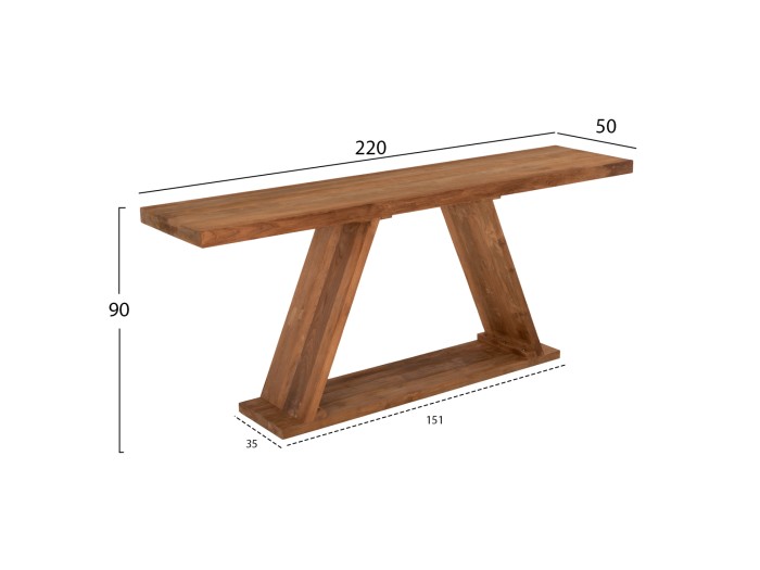 HM9555---Κονσόλα από ξύλο ΤΕΑΚ σε κανονικό μακρόστενο ορθογώνιο σχήμα επιφάνειας. Στηρίζεται σε μια μικρότερη επιφάνεια στο έδαφος και σε 2 πλάγιες σανίδες από το ίδιο ξύλο που δίνουν ένα τριγωνικό σχήμα. Το ΦΥΣΙΚΟ χρώμα όλου του επίπλου προσδίδει μια ακαταμάχητη εικόνα που θα αποτελέσει το σημείο αναφοράς οπουδήποτε κι αν τοποθετηθεί η κονσόλα! Αποτελεί την επιτομή της ρουστίκ διακόσμησης σε λιτή κι απέριττη υλοποίηση, για τον χώρο που επιθυμείτε. Τι είναι όμως η κονσόλα; Η κονσόλα είναι ένα κομψό, γραφικό, συμπαγές έπιπλο που μπορεί να τοποθετηθεί σε σχεδόν οποιοδήποτε δωμάτιο- κουζίνα, διάδρομο, κρεβατοκάμαρα, παιδικό δωμάτιο, σαλόνι, dressing room, γραφείο, ακόμα και στο μπάνιο. Με αυτό, ο σχεδιασμός του χώρου γίνεται εκλεπτυσμένος, κομψός, πλήρως σκεπτόμενος. Η κονσόλα στο εσωτερικό χρησιμοποιείται τόσο ως μέρος ενός σετ με πολλά στοιχεία, όσο και ανεξάρτητα και επιλέγεται για τον γενικό σχεδιασμό του δωματίου.