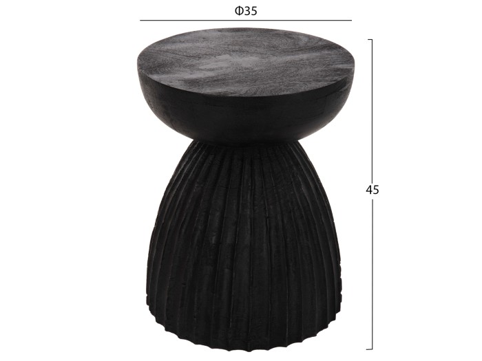 Το σκαμπό σαλονιού SCALLOP που είναι εξολοκλήρου κατασκευασμένο από μασίφ ξύλο mango σε ΜΑΥΡΟ χρώμα μπορεί να χρησιμοποιηθεί και ως βοηθητικό τραπεζάκι, χάρη στο κωνικό σχήμα της βάσης που καταλήγει στην στρογγυλή επιφάνεια. Ένα σκαμπό που θα εντυπωσιάσει με τις πτυχώσεις της βάσης και το χρώμα του, αφού είναι sand blasted, προσδίδοντας εικόνα παλαιότητας στο έπιπλο.