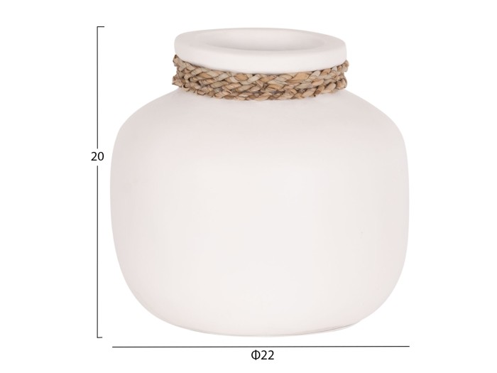 Το επιτραπέζιο χειροποίητο διακοσμητικό βάζο CAMMER είναι κατασκευασμένο εξολοκλήρου από τερακότα σε ΛΕΥΚΟ χρώμα ενώ διαθέτει διακοσμητική πλέξη από rattan περιμετρικά στον «λαιμό» του βάζου. Ιδανικό για πληθώρα χώρων, τόσο για το σπίτι, όσο και για επαγγελματικούς χώρους.