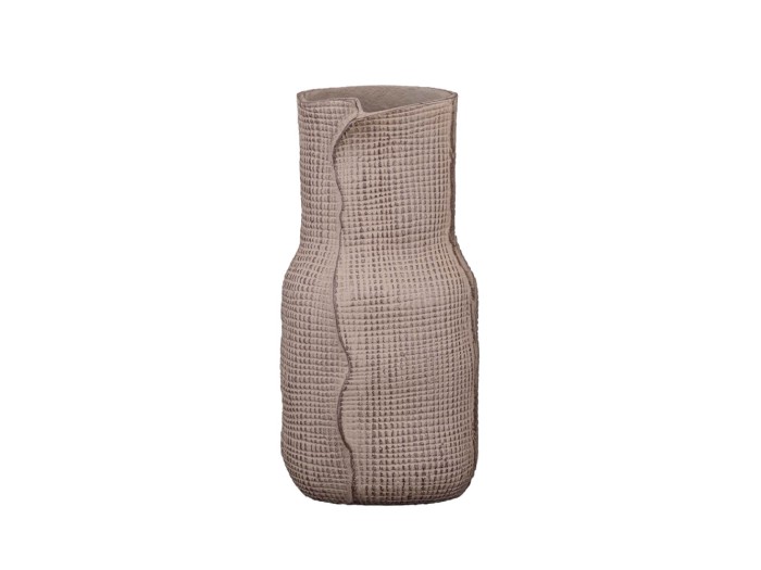 Το βάζο VEIL ξεχωρίζει για την ιδιαίτερη υφή του και τη μαλακή, οργανική του γραμμή. Η ανάγλυφη επιφάνεια στο αλουμίνιο δημιουργεί ένα ενδιαφέρον παιχνίδι φωτός και σκιάς, ενώ οι δύο αποχρώσεις του καφέ, ανοιχτή και σκούρα, προσθέτουν βάθος και φυσική ισορροπία.