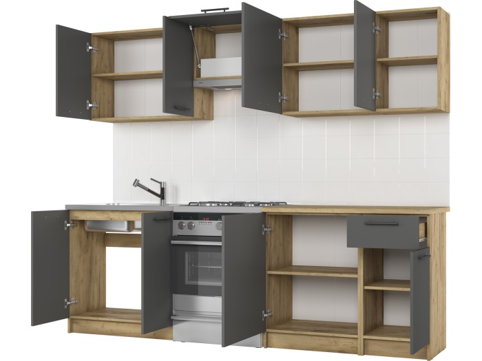 μήκος σετ: 240cm, ανυψωτικά υγραερίου, πάχος πάγκου: 28mm, χρώματα: εμπρός - craft oak, σώμα - ανθρακί, πάγκος εργασίας - ανθρακί