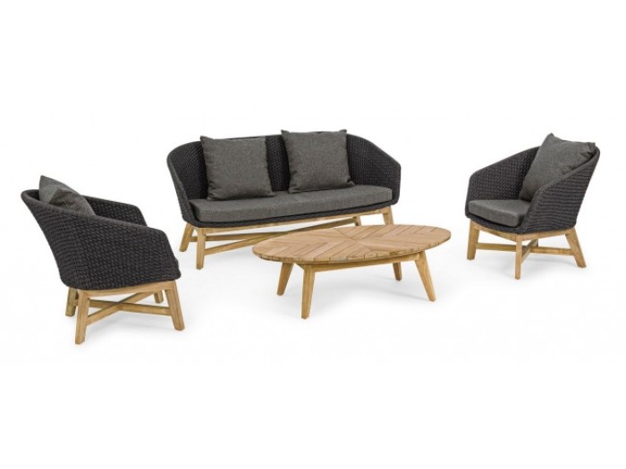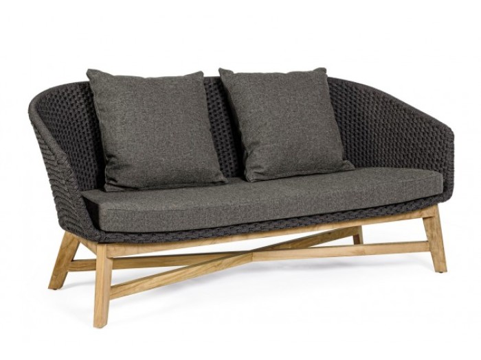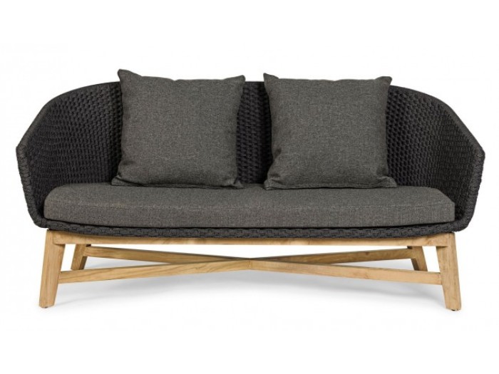 Διθέσιος καναπές εξωτερικού χώρου, ο οποίος διαθέτει μεταλλικό σκελετό αλουμινίου ηλεκτροστατικής βαφής, ξύλινη βάση teak και πλαίσιο πλεχτού σχοινιού υδατοαπωθητικό και ανθεκτικό στις ακτίνες UV.