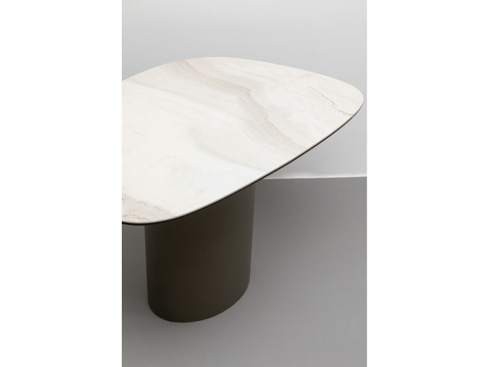 - Το εντυπωσιακό χαρακτηριστικό αυτού του τραπεζιού σαλονιού είναι η κεραμική επιφάνεια με οργανικό σχήμα