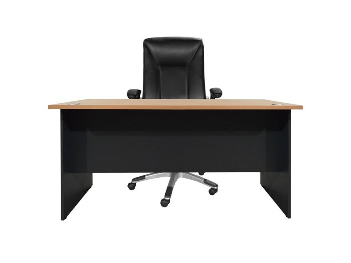 Επιφάνεια εργασίας από μελαμίνη πάχους 25mm στο χρώμα οξιάς, με δύο εισόδους καλωδίων πάνω από τα πόδια. Πόδια μελαμίνης πάχους 18mm σε χρώμα γκρί.