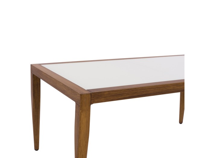 Επαγγελματικό τραπεζάκι χαμηλό για καθιστικό αλουμινίου, σε bamboo look απόχρωση με γυαλί στην επιφάνειά του.