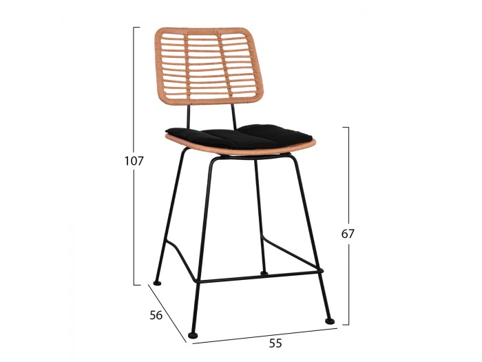 Μοντέρνο σκαμπό εξωτερικού, αλλά και εσωτερικού χώρου, κατασκευασμένο από μεταλλικό σκελετό σε μαύρη απόχρωση και πόδια από μασίφ σίδερο και επενδυμένο με πλεκτό wicker σε μπεζ απόχρωση.