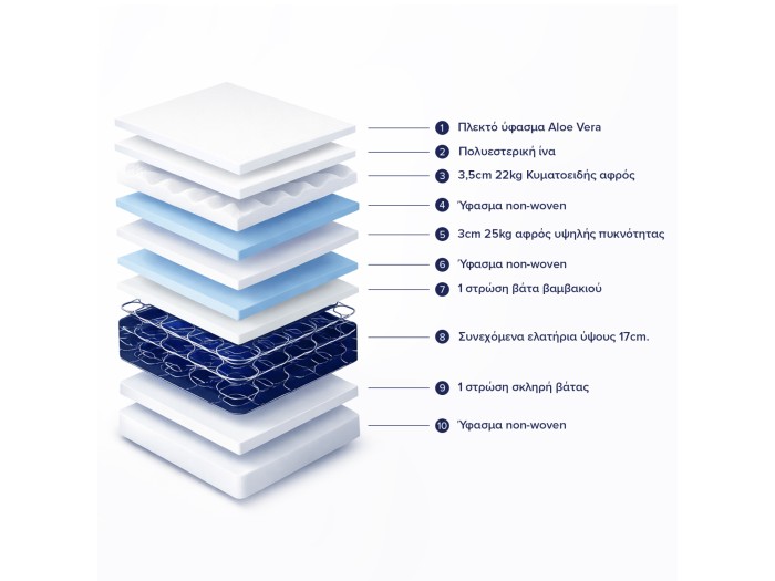 Στο κάτω μέρος του στρώματος υπάρχουν στρώσεις από σκληρό αφρολέξ και non-woven ύφασμα στο τελείωμα.