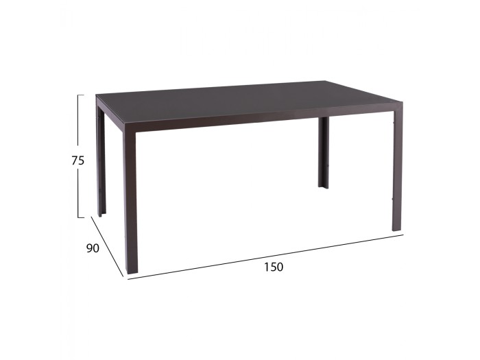 Ένα τραπέζι τραπεζαρίας εξωτερικού χώρου σε καφέ απόχρωση με γυαλί στην επιφάνειά του.