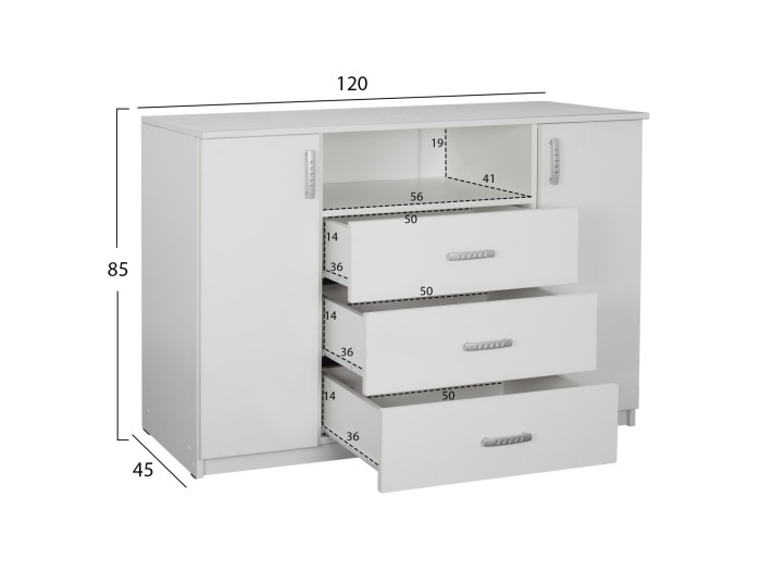 Διαθέτει τρία συρτάρια, δύο ντουλάπια και μία ανοικτή επιφάνεια, για να αποθηκεύετε μικρά αντικείμενα.