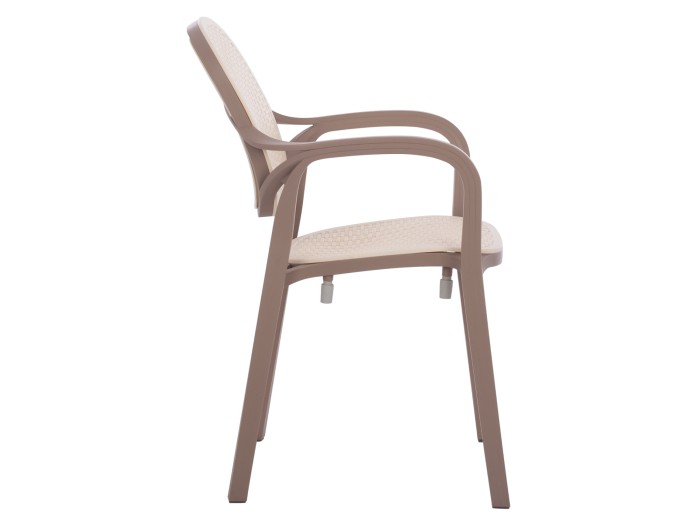 Πολυθρόνα πολυπροπυλενίου σε καπουτσίνο χρώμα με μπεζ απόχρωση στην πλάτη και στο κάθισμα. Ιδανική πρόταση τόσο για εξωτερικούς, όσο και για εσωτερικούς χώρους. Η πολυθρόνα έχει ψηλά μπράτσα και το κάθισμα και η πλάτη τους έχουν όψη rattan. Ιδανικές για επαγγελματικούς χώρους αλλά και για το σπίτι σας, θα σας χαρίσουν άνεση και ξεκούραση χάρη στην όμορφη σχεδίαση του καθίσματός τους και στα ψηλά τους μπράτσα με στρογγυλεμένες γωνίες.