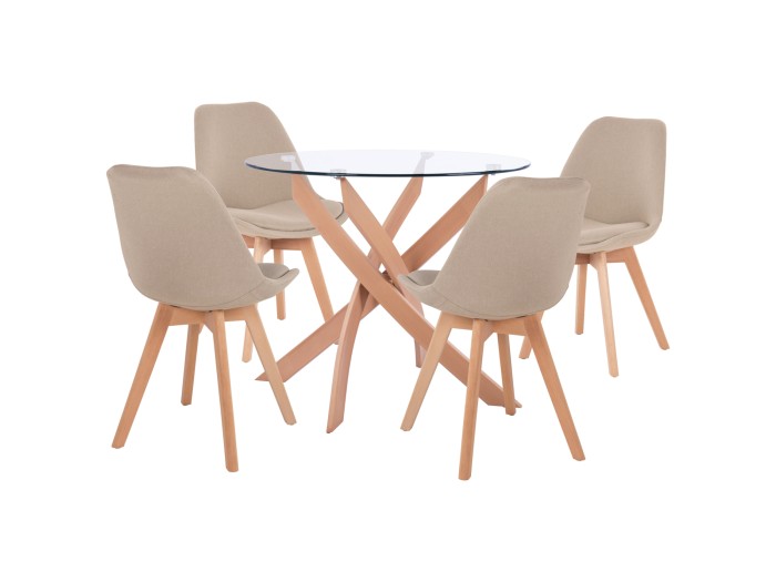 Τέσσερεις μοντέρνες καρέκλες σε έναν άψογο συνδυασμό ξύλου και υφάσματος σε μπεζ και φυσική απόχρωση. Μια πρόταση που θα αναδείξει κάθε γωνία του σπιτιού σας.