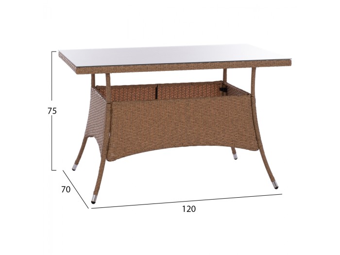 Το τραπέζι και οι πολυθρόνες είναι κατασκευασμένα από μεταλλικό σκελετό, εξαιρετικής ποιότητας με αντοχή στη φθορά και το χρόνο, και επένδυση με πλεκτό wicker/rattan.