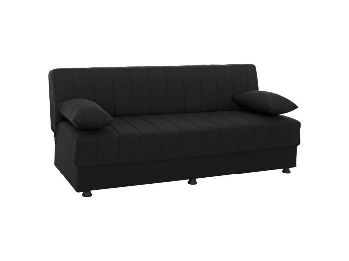 Ξεκινώντας από τα βασικά και τα προφανή, το χρώμα της επένδυσης με το εξαιρετικό και καλοραμμένο ύφασμα αυτού του καναπέ, είναι ΜΑΥΡΟ. Διαθέτει 2 μικρά μακρόστενα μαξιλάρια με το ίδιο ύφασμα που μπορούν να χρησιμοποιηθούν όπως θέλει ο καθένας. Χαρακτηριστικό αυτού του καναπέ είναι ότι δεν διαθέτει μπράτσα με αποτέλεσμα να μην περιορίζει την χρήση του από τους χρήστες του. Επίσης, γίνεται πολύ εύκολα κρεβάτι μέσω ενός εύχρηστου μηχανισμού (κλικ-κλακ) πολλαπλασιάζοντας την χρησιμότητά του. Κάτω από το κάθισμα του καναπέ υπάρχουν 2 αποθηκευτικοί χώροι με ενισχυμένο πάτωμα καθιστώντας τον ένα πραγματικό πολυεργαλείο, ειδικά για φοιτητικά σπίτια αλλά και σπίτια με περιορισμένο γενικά χώρο.