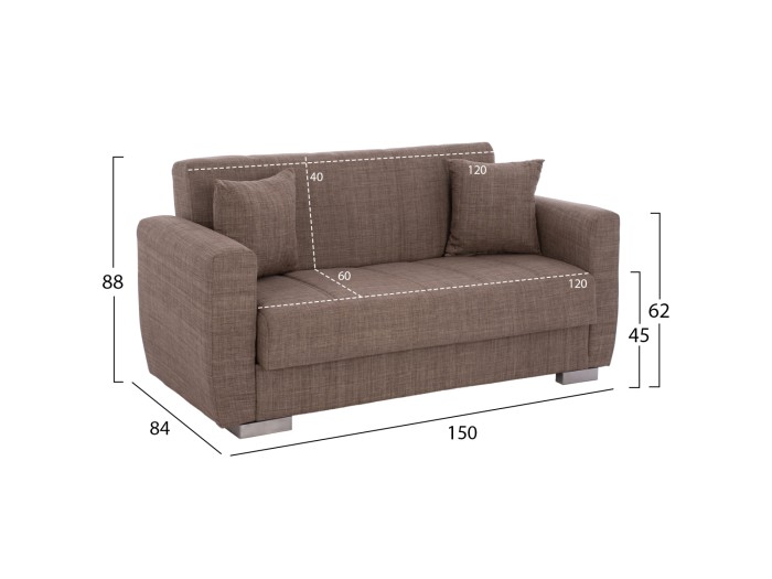 Το κύριο χαρακτηριστικό του καναπέ, όμως, είναι ότι πέφτει η πλάτη και μετατρέπεται σε ένα άνετο κρεβάτι για έκτακτες περιπτώσεις, μέσω ενός εύχρηστου μηχανισμού «κλικ-κλακ». Συνέπεια αυτού, βέβαια, είναι και η ύπαρξη αποθηκευτικού χώρου κάτω από το κάθισμα του καναπέ, ο οποίος πάντα είναι χρήσιμος, ειδικά σε φοιτητικά σπίτια. Τέλος, τα πόδια του καναπέ είναι φαρδιά και χαμηλά δίνοντας στιβαρότητα σε όλη την κατασκευή.