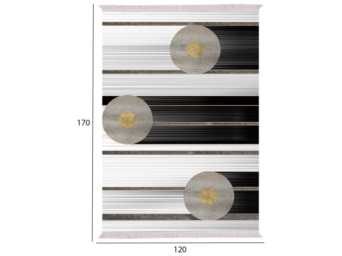 Το συγκεκριμένο χαλί είναι μοντέρνο από όποια οπτική κι αν το δεις. Έχει κυρίαρχα χρώματα το άσπρο, το γκρι, το μαύρο και το χρυσό. Το έντονο χαρακτηριστικό του είναι οι λευκοί δίσκοι με τα χρυσά κέντρα, που δίνουν την αίσθηση της αιώρησης και της κίνησης και φυσικά θα προκαλέσει το ενδιαφέρον με την ιδιαίτερη λεπτομέρεια και συμμετρία των γραμμών του. Σίγουρα θα αναβαθμίσει αισθητικά το σαλόνι σας.