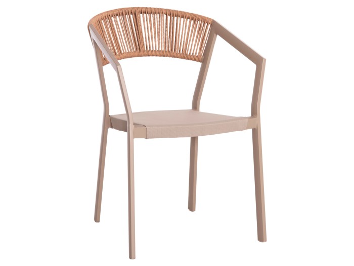 Η πλάτη της πολυθρόνας είναι επενδυμένη με πολυεστερικό RATTAN. Στα περισσότερα έπιπλα κήπου και γενικά σε έπιπλα για εξωτερικούς χώρους χρησιμοποιείται συνθετικό υλικό από PVC, δηλαδή τεχνητές ίνες υψηλής ποιότητας. Αυτό δίνει στην κατασκευή εξαιρετική αντοχή και ανθεκτικότητα σε ακραίες συνθήκες ζέστης ή κρύου.