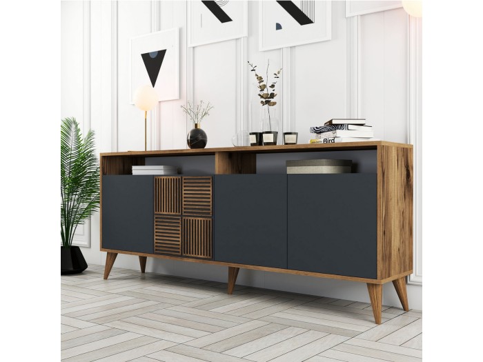 Ο μπουφές ΗΜ9431.01 είναι ένα επιβλητικό έπιπλο όπου κι αν τον τοποθετήσετε. Έχει ψηλά και πλαγιαστά πόδια σε καρυδί απόχρωση και δύο μεγάλα ντουλάπια με ράφι, που ανοίγουν με διπλές πόρτες. Ακριβώς επάνω από τα ντουλάπια και κάτω από την επάνω επιφάνεια υπάρχει ανοιχτός χώρος αποθήκευσης. Το μήκος του εξασφαλίζει ότι η επιφάνεια του είναι μεγάλη και αρκετή για τοποθέτηση πολλών αντικειμένων. Το χρώμα όλης της κατασκευής είναι καρυδί, ενώ όλες οι πόρτες είναι σε ανθρακί απόχρωση. Η μία πόρτα, μάλιστα, φέρει και καρυδί λεπτομέρειες. Ο μπουφές αυτός θα σας ενθουσιάσει! Τι είναι όμως ο μπουφές; Ο μπουφές είναι ένα άκρως πρακτικό έπιπλο, αφού στους αποθηκευτικούς του χώρους μπορούμε να βάλουμε από σερβίτσια πιάτων και ποτήρια, μέχρι κεριά και διάφορα άλλα χρηστικά αντικείμενα που έχουμε στο σπίτι μας, ώστε να είναι τακτοποιημένα και να μη δημιουργούν ακαταστασία στο χώρο.