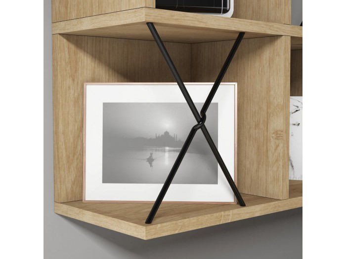 Το ράφι τοίχου μελαμίνης ΗΜ9520.01 σε φυσικό ΟΑΚ χρώμα, συνδυάζει το απέριττο design με την πρακτικότητα. Αποτελείται από μια διάταξη 4 ραφιών σε μορφή κύβων, 2 εκ των οποίων έχουν και «πλάτη», με 2 μαύρα μεταλλικά Χ (βέργες) να προσφέρουν την μοντέρνα πινελιά στην κατασκευή, αλλά και μια όμορφη διχρωμία.