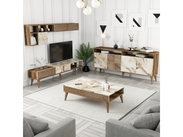 Η σύνθεση ΗΜ11845.03 θα αλλάξει την όψη στο σαλόνι σας και θα σας προσφέρει την αναβάθμιση που θέλετε. Αποτελείται από έναν συνδυασμό επίπλων για την τηλεόρασή σας με μονάδα δαπέδου και επιτοίχια ράφια, ένα τραπεζάκι σαλονιού, και έναν μπουφέ. Όλη η σύνθεση είναι της ίδιας σειράς και τα κυρίαρχα χρώματα είναι το ΚΑΡΥΔΙ και το ΛΕΥΚΟ ΜΑΡΜΑΡΟ.