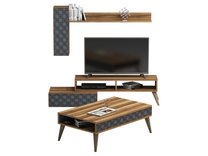 Η σύνθεση ΗΜ11850.04 θα αλλάξει την όψη στο σαλόνι σας και θα σας προσφέρει την αναβάθμιση που θέλετε. Αποτελείται από έναν συνδυασμό επίπλων για την τηλεόρασή σας με μονάδα δαπέδου, επιτοίχιο ράφι και επιτοίχιο ντουλάπι, και ένα τραπεζάκι σαλονιού. Όλη η σύνθεση είναι της ίδιας σειράς με συνδυασμό χρωμάτων ΚΑΡΥΔΙ με ΜΠΛΕ.