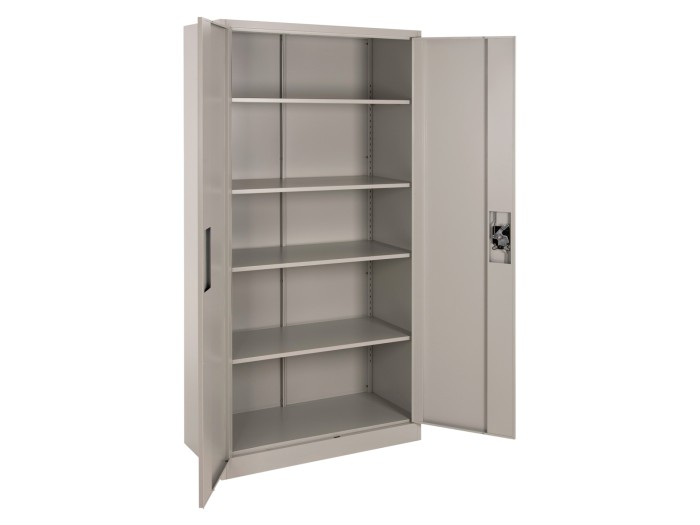 Η DURON είναι μια πρακτικότατη μεταλλική ντουλάπα που έχει φτιαχτεί με γνώμονα την χωρητικότητα και την ανθεκτικότητα. Είναι δίφυλλη με τις δύο πόρτες να κλείνουν ακριβώς στην μέση της κατασκευής, ενώ το εσωτερικό είναι ένας ενιαίος χώρος χωρίς κάθετα χωρίσματα. Διαθέτει 4 ράφια που δημιουργούν 5 αποθηκευτικούς χώρους. Οι πόρτες διαθέτουν κλειδαριά που κλειδώνει με κλειδί, ενώ το χρώμα της ντουλάπας είναι πολύ ανοιχτό γκρι.